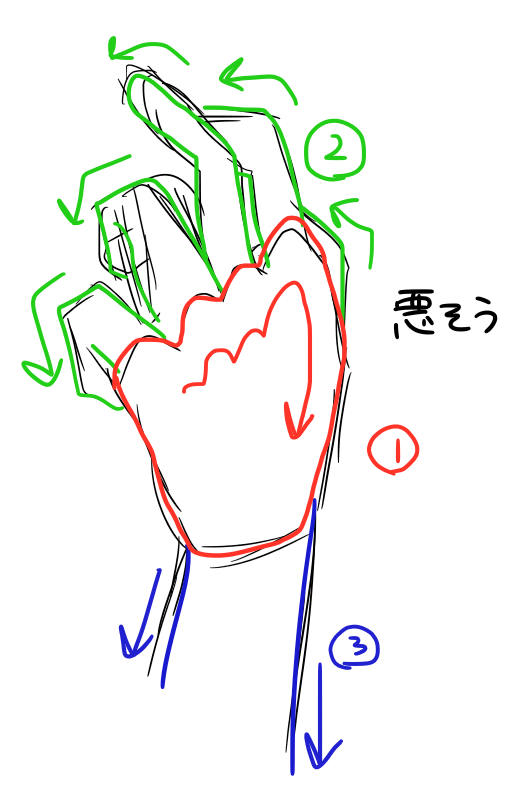そもそも私が描くことが多い手指はイカ、間違えた、以下のようなものです。