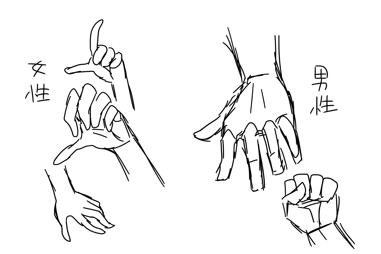 女性は細く長く、指先も丸めに描くとそれっぽくなると思います。